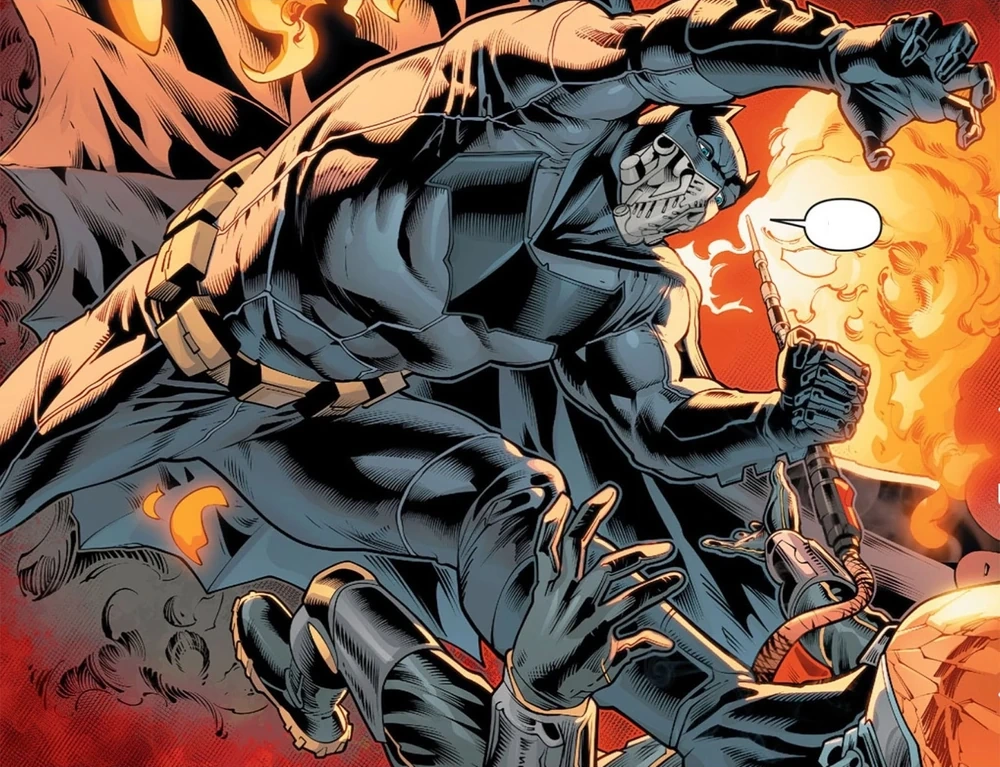 Suddenly, a Batarang stopped Firefly from detonating the explosives, and Batman then appeared behind the team to destroy the detonator. Using a flamethrower, Firefly boasted about his armor that allowed him to breathe oxygen, only to be surprised by a respirator used by Batman. Furious, the Dark Knight proceeded to beat him severely, destroying his armor completely. Seeing the brutality of the event, Sal and the ex-military man were unable to shoot Batman, throwing their weapons to the ground. Quickly, Sal and his partner were knocked unconscious to be tied up by Batman and handed over to the Gotham City Police Department.[1]